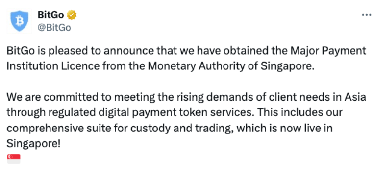 Калифорнийская компания по хранению криптовалют BitGo получила лицензию крупнейшего платёжного учреждения от Валютного управления Сингапура.