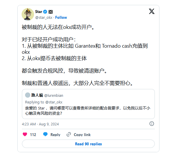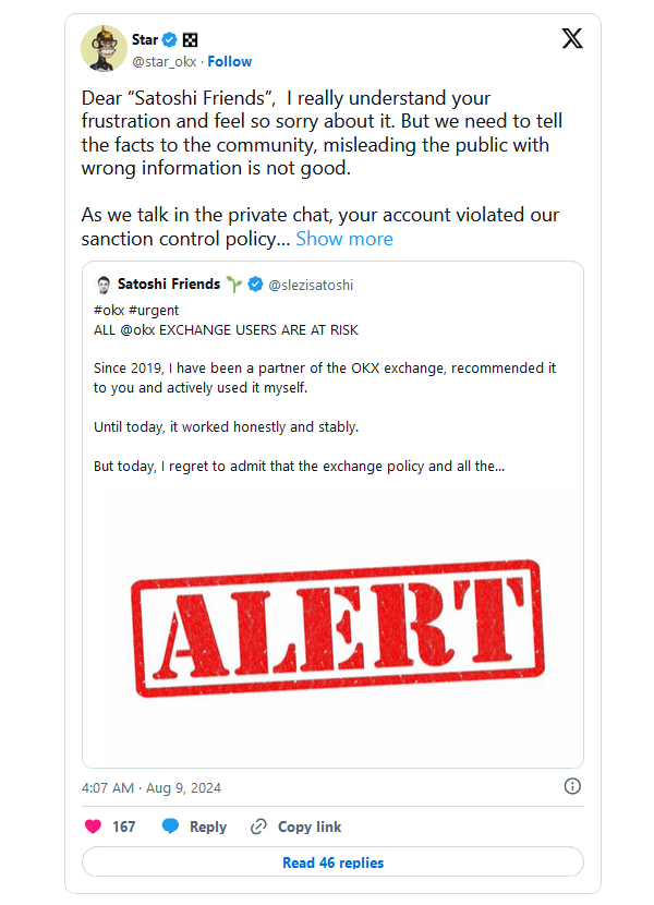 Позже Стар Ксу лично прокомментировал обращение блогера. По словам главы биржи, аккаунт Манвеляна нарушил правила OKX, поскольку взаимодействовал с платформами из санкционных списков.