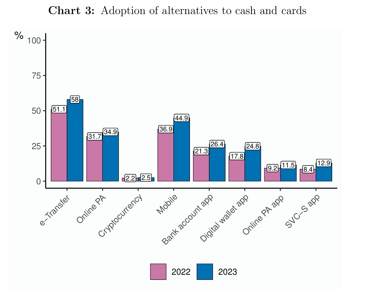 Из множества других альтернатив наличным деньгам и картам большинство канадских респондентов предпочли электронный перевод — метод перевода денег с использованием адресов электронной почты или номеров телефонов.