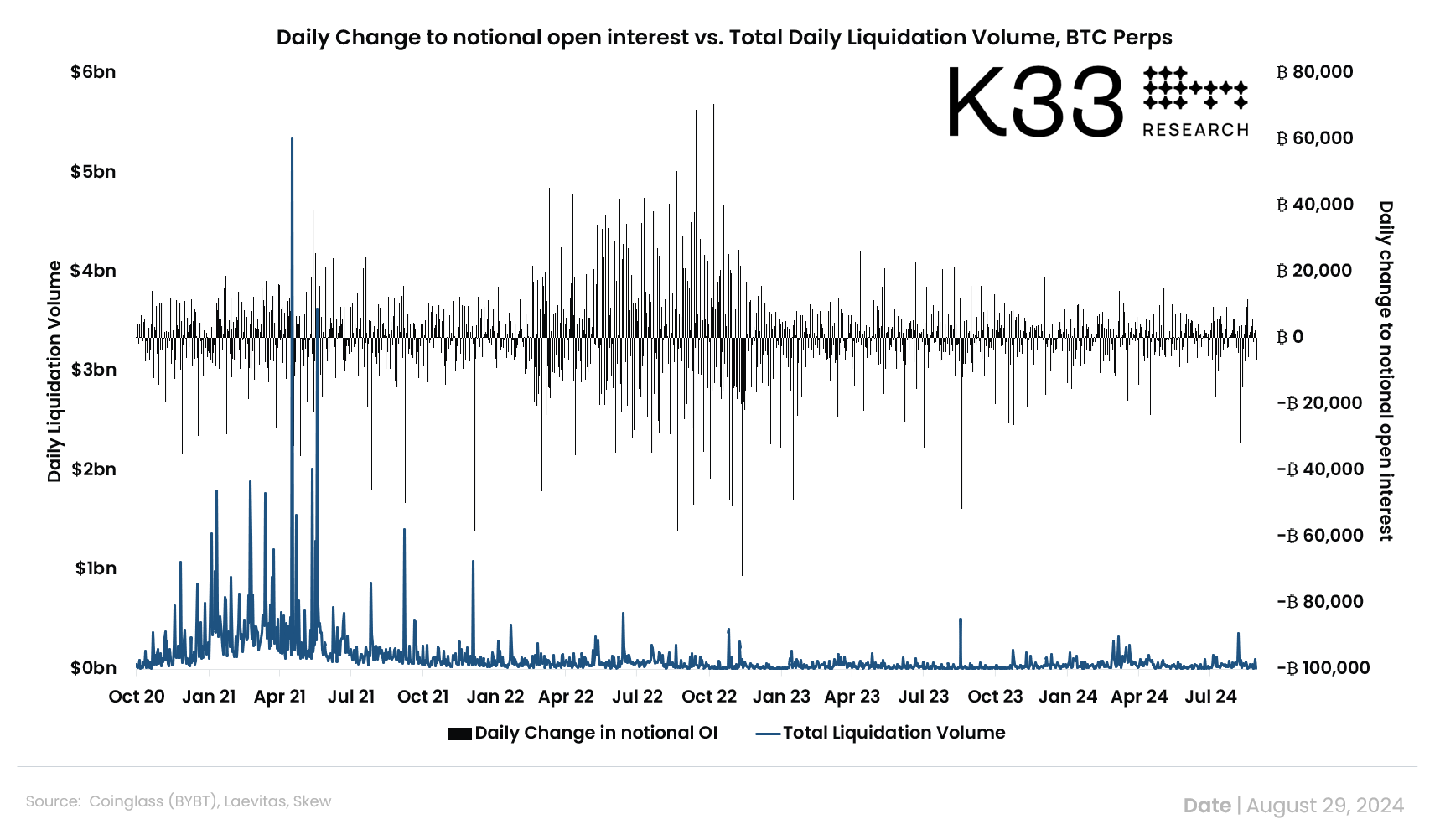 Изменения в OI по сравнению с ликвидациями. Источник: K33 Research