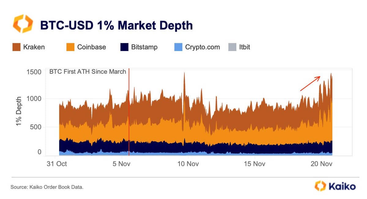 Как отмечают представители Kaiko, сейчас для изменения стоимости BTC на 1 процент в ту или иную сторону требуется проведение сделок с 1400 монетами. Подобное позволяет проводить крупные операции и делает криптоактив более привлекательным для институциональных инвесторов-профессионалов.