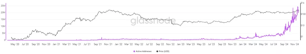 Улучшились и другие ончейн-метрики вроде числа активных адресов. На пике показатель составил 24,48 млн.