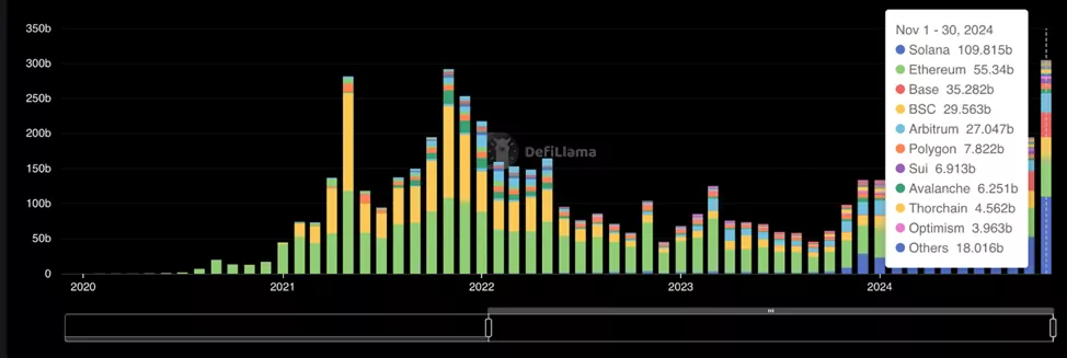 За неполный ноябрь объем торгов на децентрализованных биржах (DEX) в сети Solana достиг рекордных $109,8 млрд. Для сравнения, у Ethereum показатель почти вдвое ниже — $55,3 млрд, согласно DeFi Llama.
