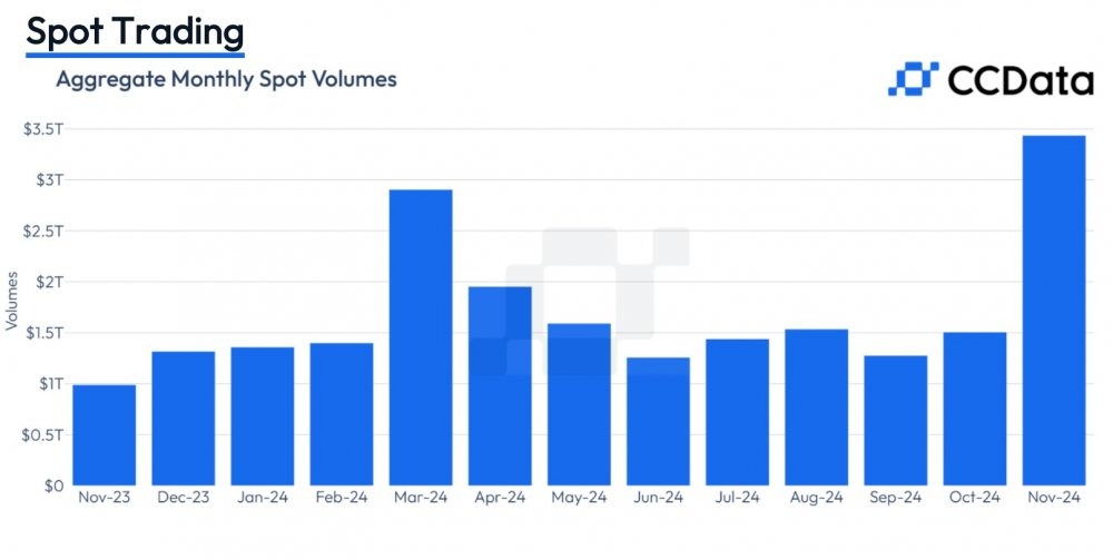 Повышенная активность была особенно очевидна на спотовых рынках криптовалют, где ежемесячные объемы выросли почти на 130% и превысили $3,4 трлн, согласно отчету.