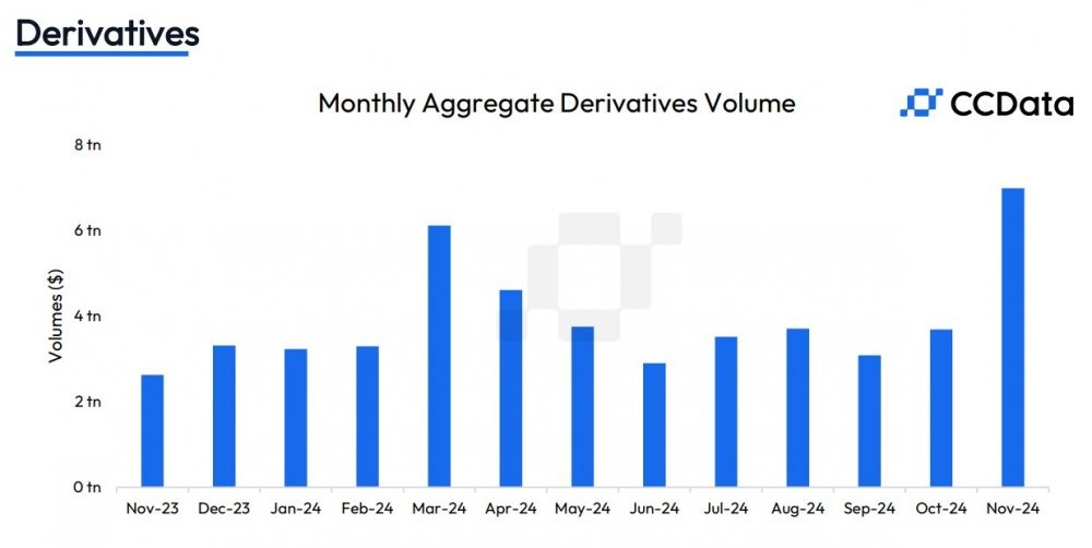 На рынках криптодеривативов также наблюдался резкий рост объемов: месячный прирост составил почти 90%, в результате чего общий объем торгов достиг почти $7 трлн, сообщает CCData.