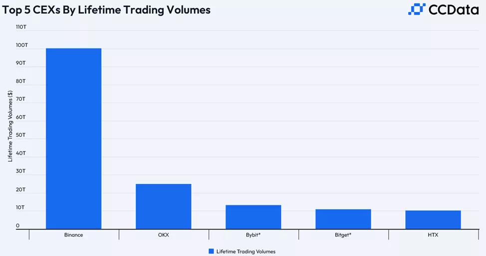 Binance стала первой CEX, которая превысила объем торгов в $100 трлн за весь срок существования, согласно CCData.