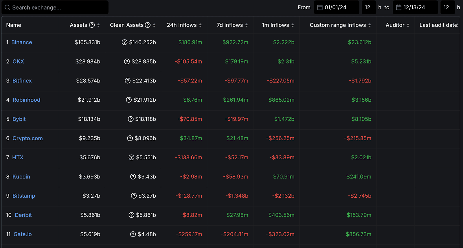 С 1 января по 13 декабря 2024 года Binance зафиксировала $23,6 млрд вливаний пользовательских средств. Этот показатель на 36% выше, чем совокупные депозиты десяти следующих бирж в рейтинге, согласно информации DefiLlama.