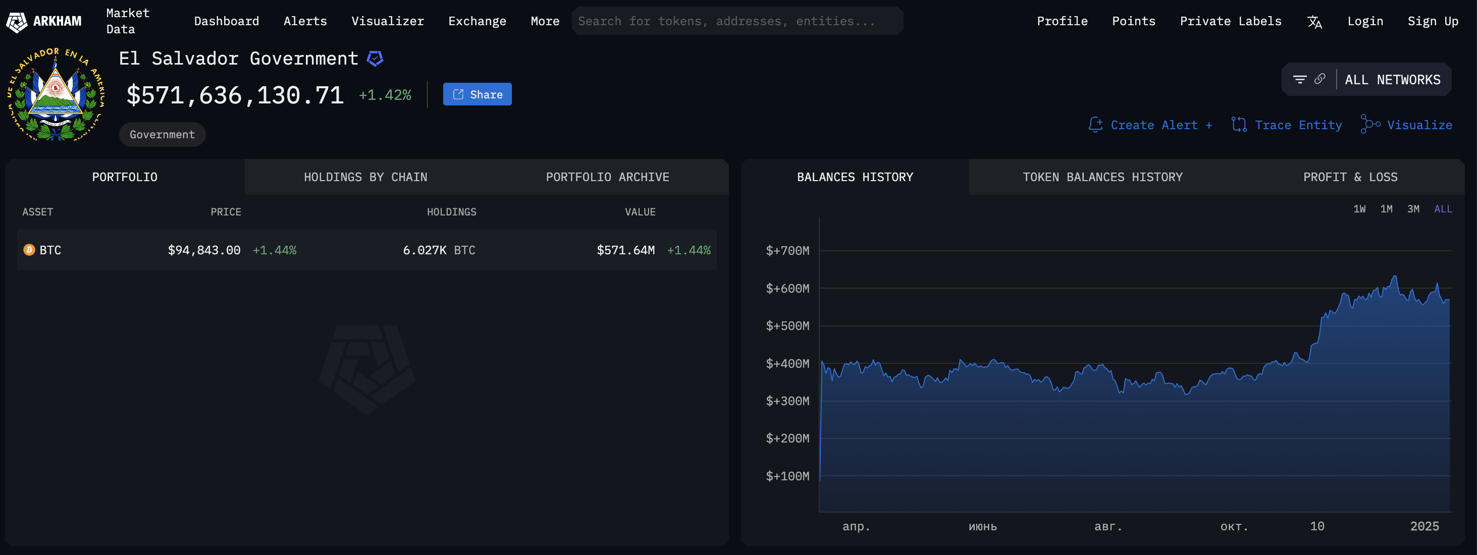 По данным Arkham, сейчас баланс страны в биткоине составляет $571 млн. Под управлением Сальвадора находятся 6 027 BTC.