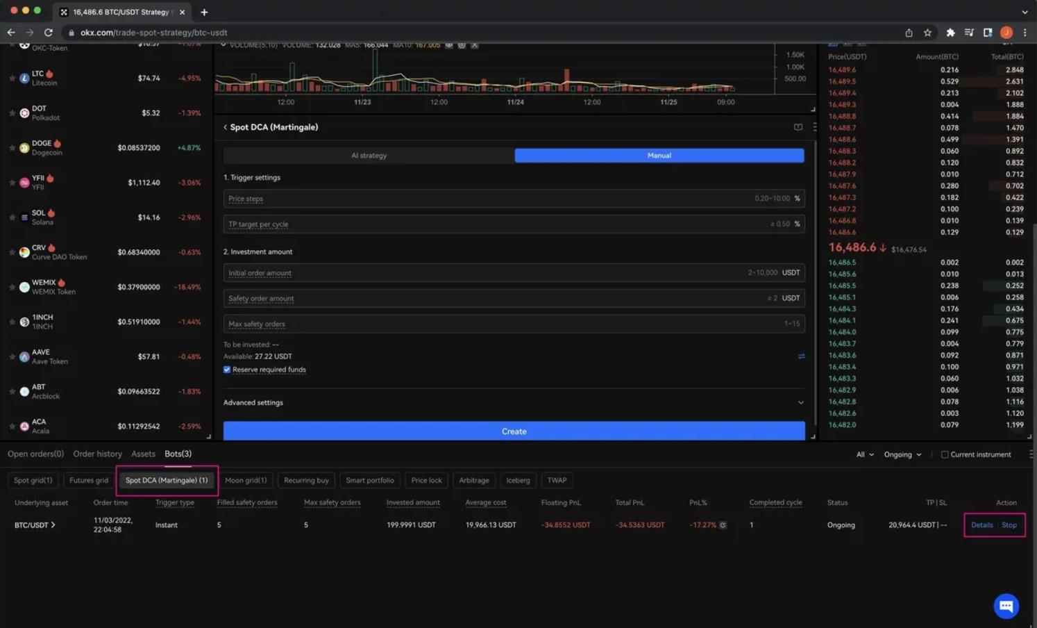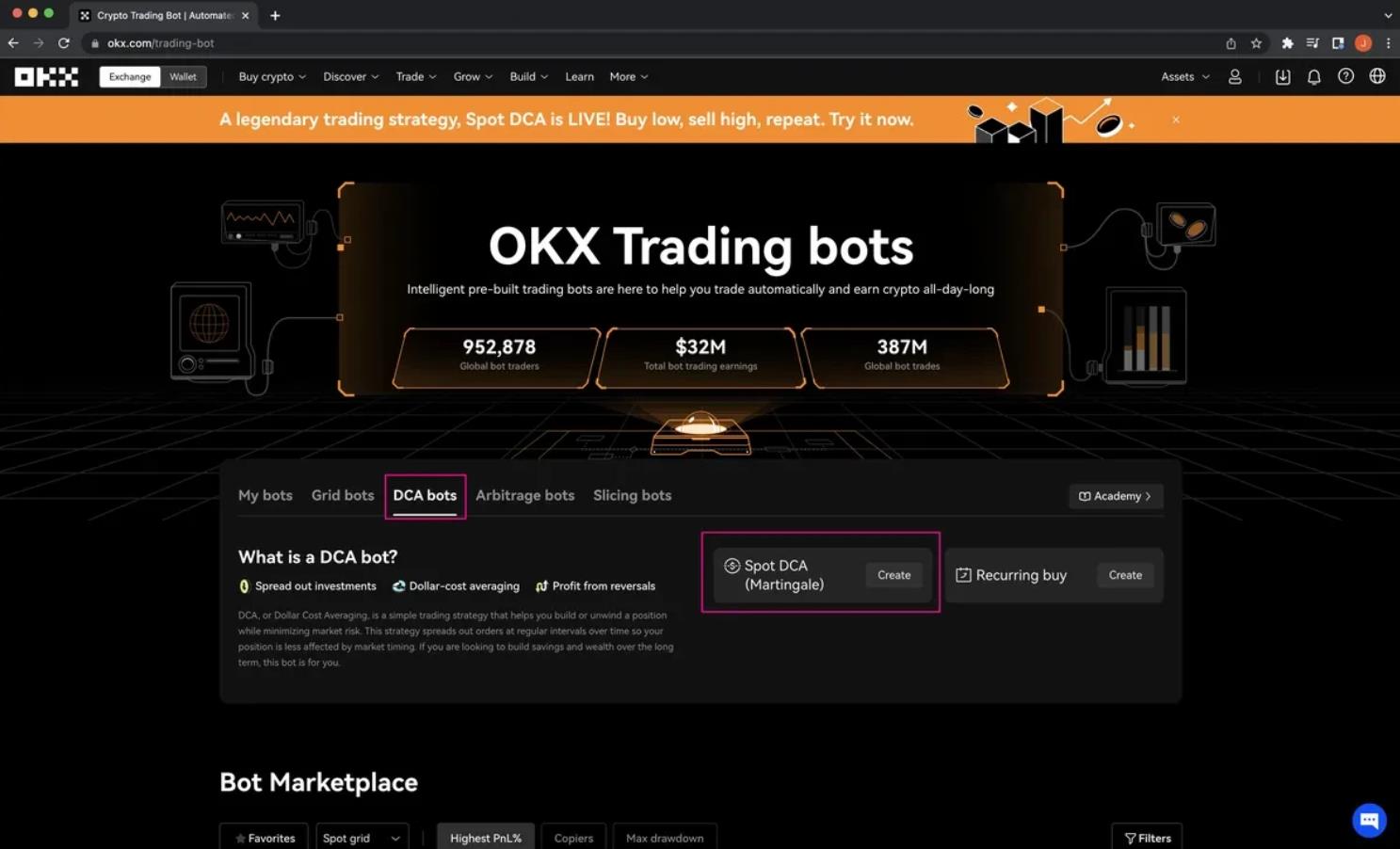 Начнем с бота, который использует стратегию усреднения долларовой стоимости (DCA) на примере биржи OKX.