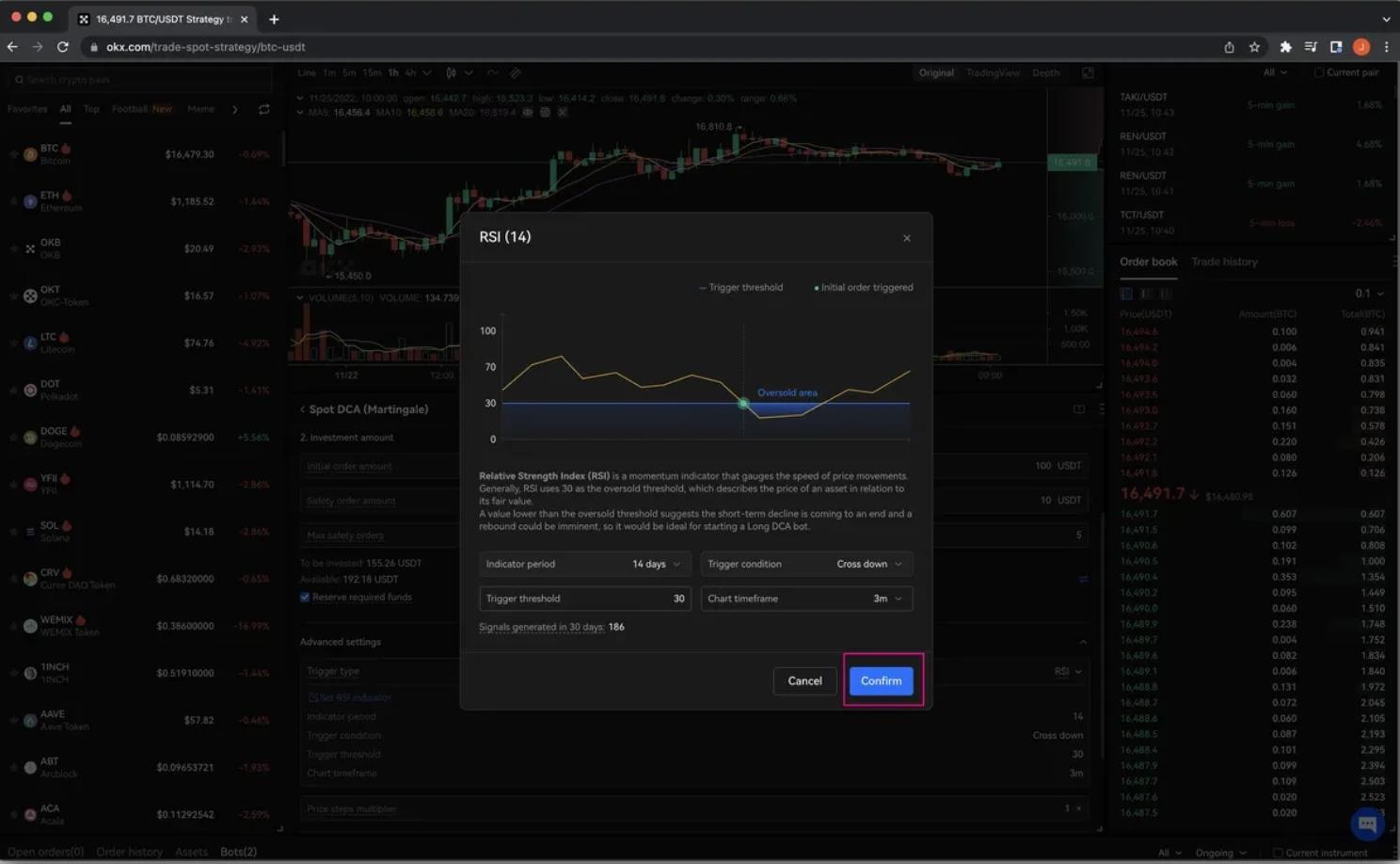 5. Для начала новых торговых циклов сразу после создания или завершения предыдущих, выберите Мгновенный запуск циклов в параметрах бота. Для запуска бота по заданным сигналам трейдер сможет использовать технические индикаторы, например RSI, для определения времени входа для каждого торгового цикла DCA.