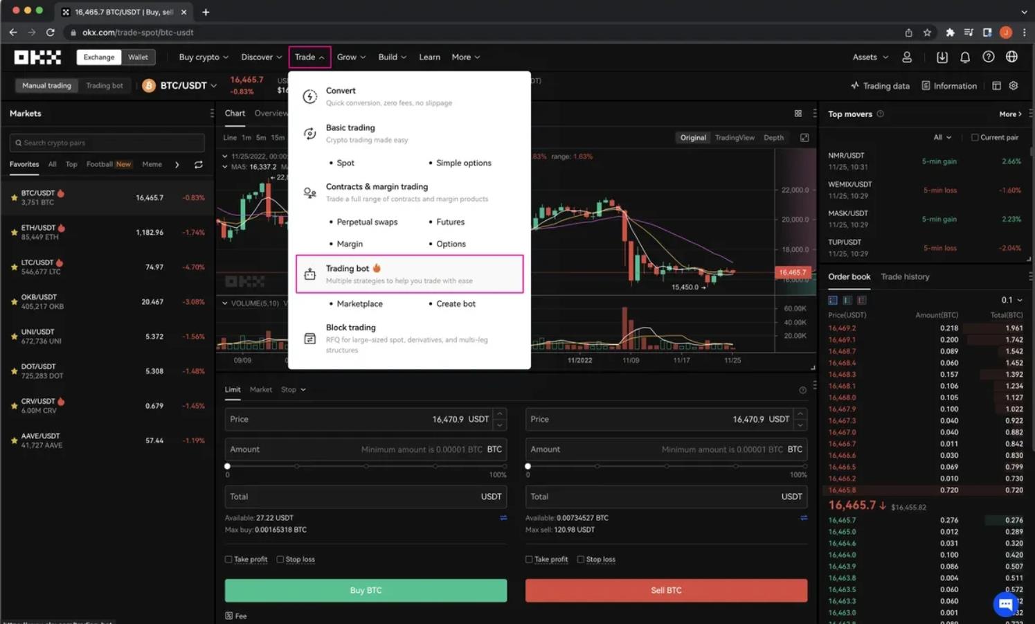 1.На панели навигации OKX откройте вкладку «Торговать» и нажмите на кнопку Торговый бот.