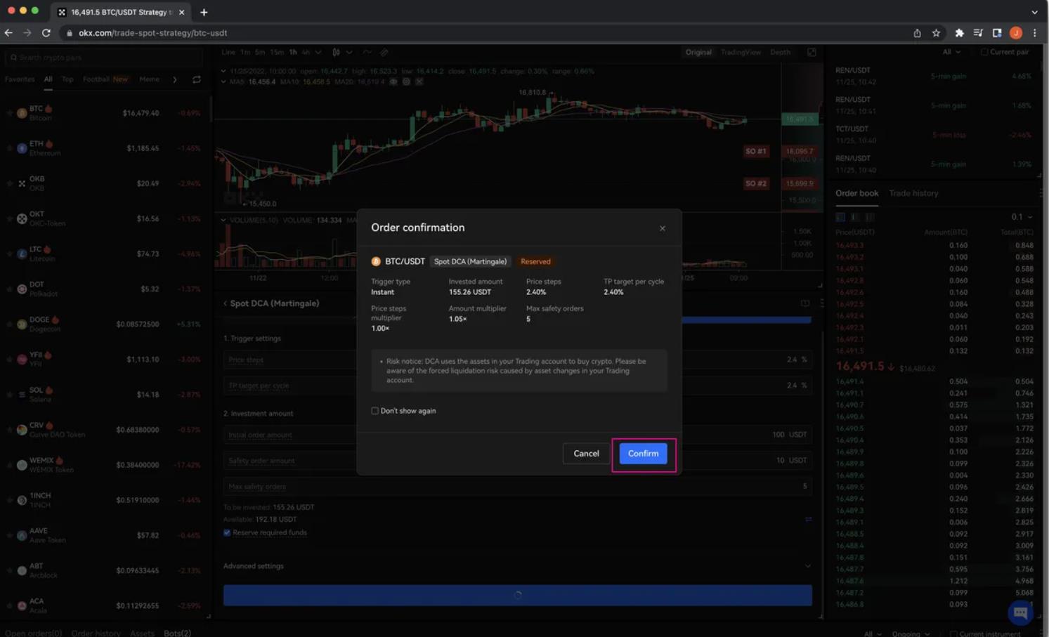 6. Проверьте данные ордера в окне подтверждения ордера. Нажмите Подтвердить, чтобы продолжить.