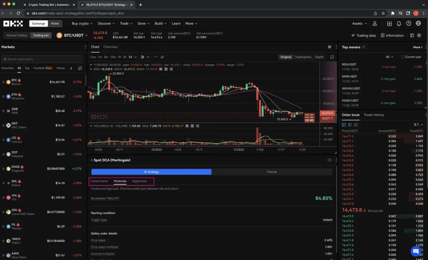 3.Выберите ИИ-стратегию, а затем настройте профиль риска (минимальный, умеренный или агрессивный). Введите сумму для дальнейшей торговли. Нажмите Создать, и DCA-бот начнет работать согласно настроенным параметрам.