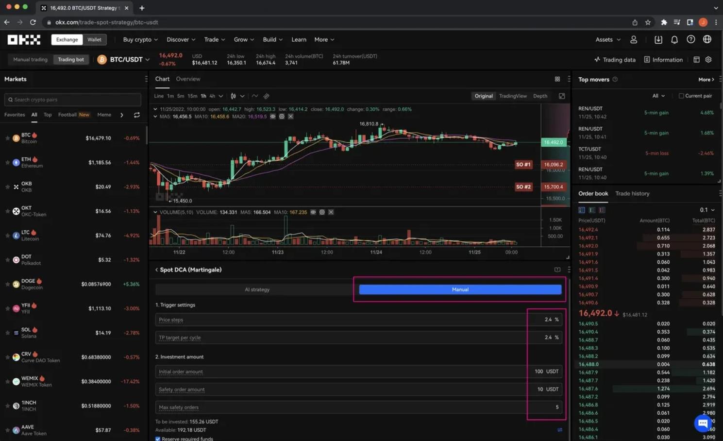4. При желании выполните ручную настройку. Укажите необходимые параметры, такие как шаг изменения цены в процентах, целевой тейк-профит цикла, сумму начального и страховочного ордеров, а также максимальное количество страховочных ордеров.