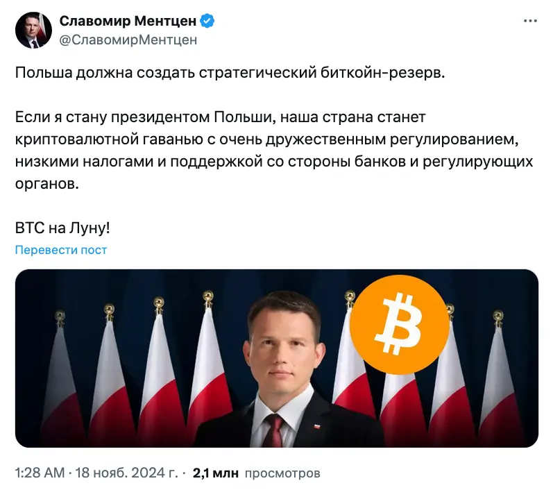 Тем временем Славомир Ментцен, кандидат в президенты Польши, пообещал превратить страну в «криптовалютную гавань», если он победит на президентских выборах 2025 года. Первый тур голосования запланирован на 18 мая.