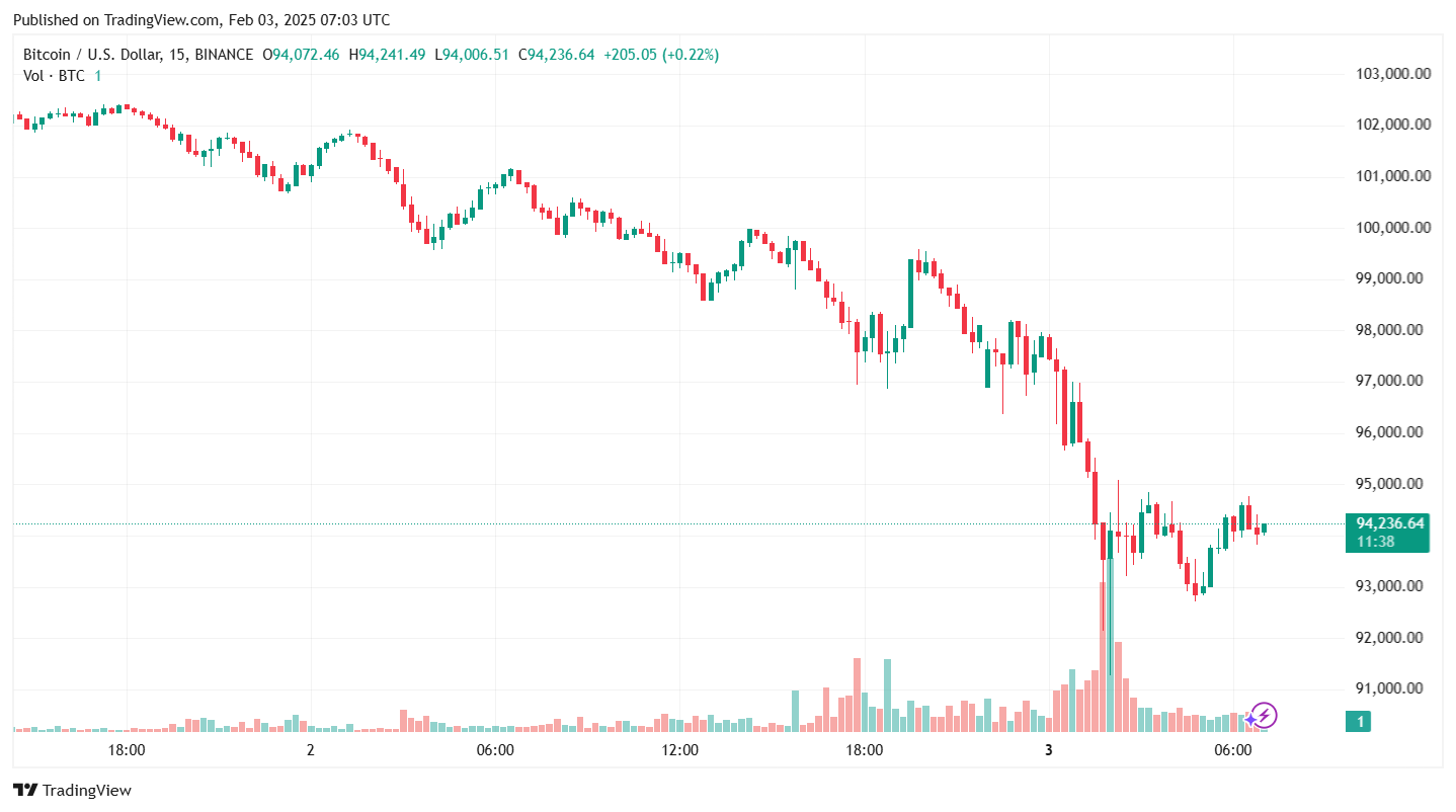Цена биткоина продолжила падение, достигнув минимума на отметке $91 281. На момент написания первая криптовалюта торгуется на уровне $94 500 с капитализацией $1,87 трлн.