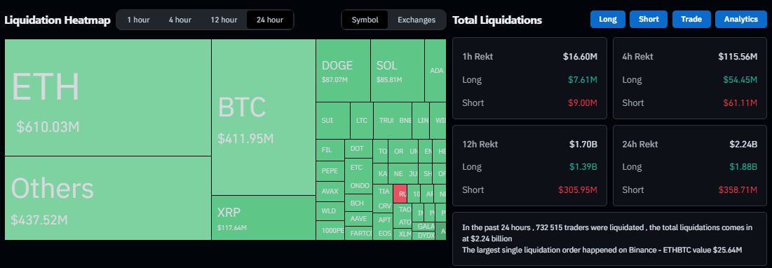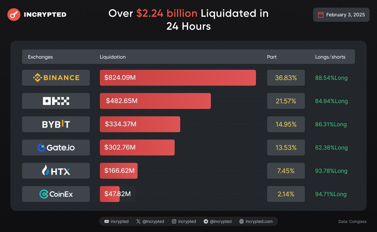 На фоне этого объем ликвидаций по фьючерсам на рынке криптовалют превысил отметку в $2,24 млрд за 24 часа.