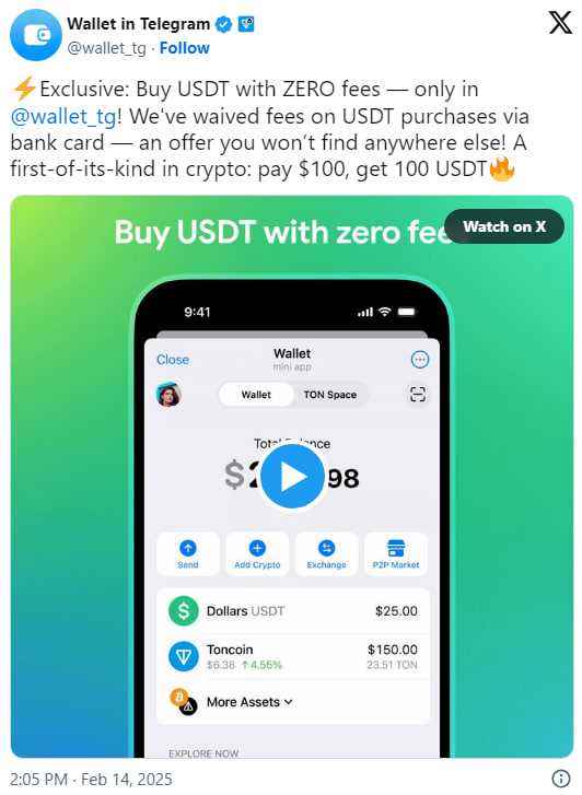 Команда встроенного криптокошелька Telegram объявила о новой акции, позволяющей пользователям покупать USDT без комиссии. Предложение распространяется на оплату банковской картой и доступно в более чем 60 странах, включая Европу, Юго-Восточную Азию и Латинскую Америку.