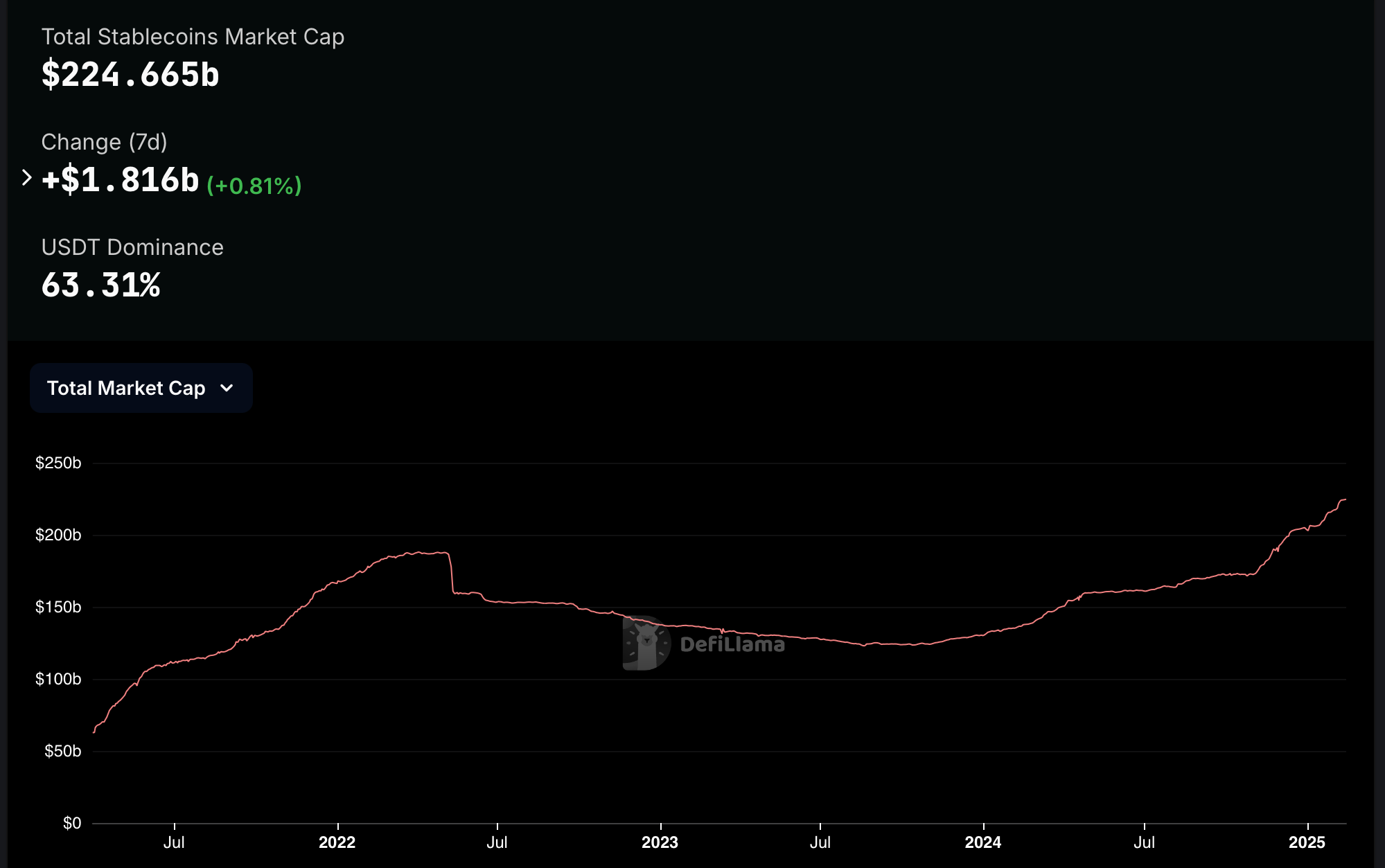 USDT, созданный Tether, является крупнейшим стейблкоином по рыночной капитализации, доминируя на рынке стейблкоинов на 63,3% по состоянию на 13 февраля 2025 года, согласно DefiLlama. Однако его доминирование в последнее время ослабевает, поскольку USD Coin (USDC), второй по величине стейблкоин по рыночной капитализации, увеличивает оборот своих токенов в 2025 году.