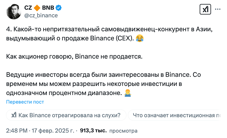 «Какой-то скромный самонадеянный конкурент в Азии муссирует слухи о продаже Binance (CEX), — сказал Чжао 17 февраля на X. — Как акционер заявляю, что Binance не продается».