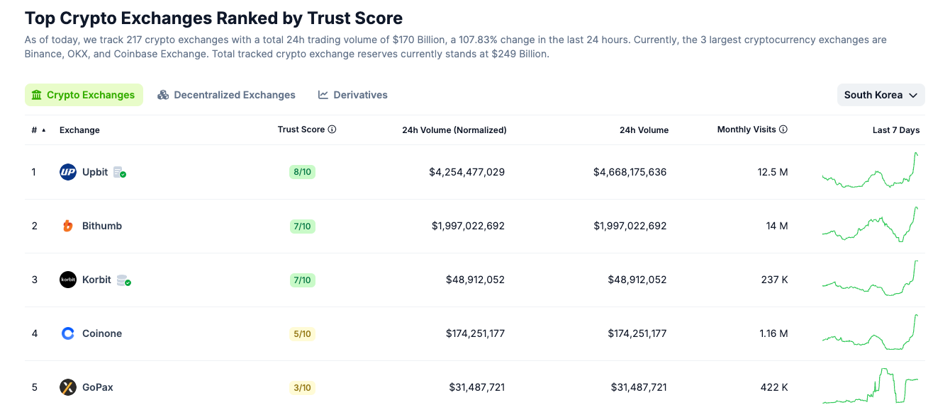 Upbit считается крупнейшей централизованной криптовалютной биржей в Южной Корее. Источник: CoinGecko