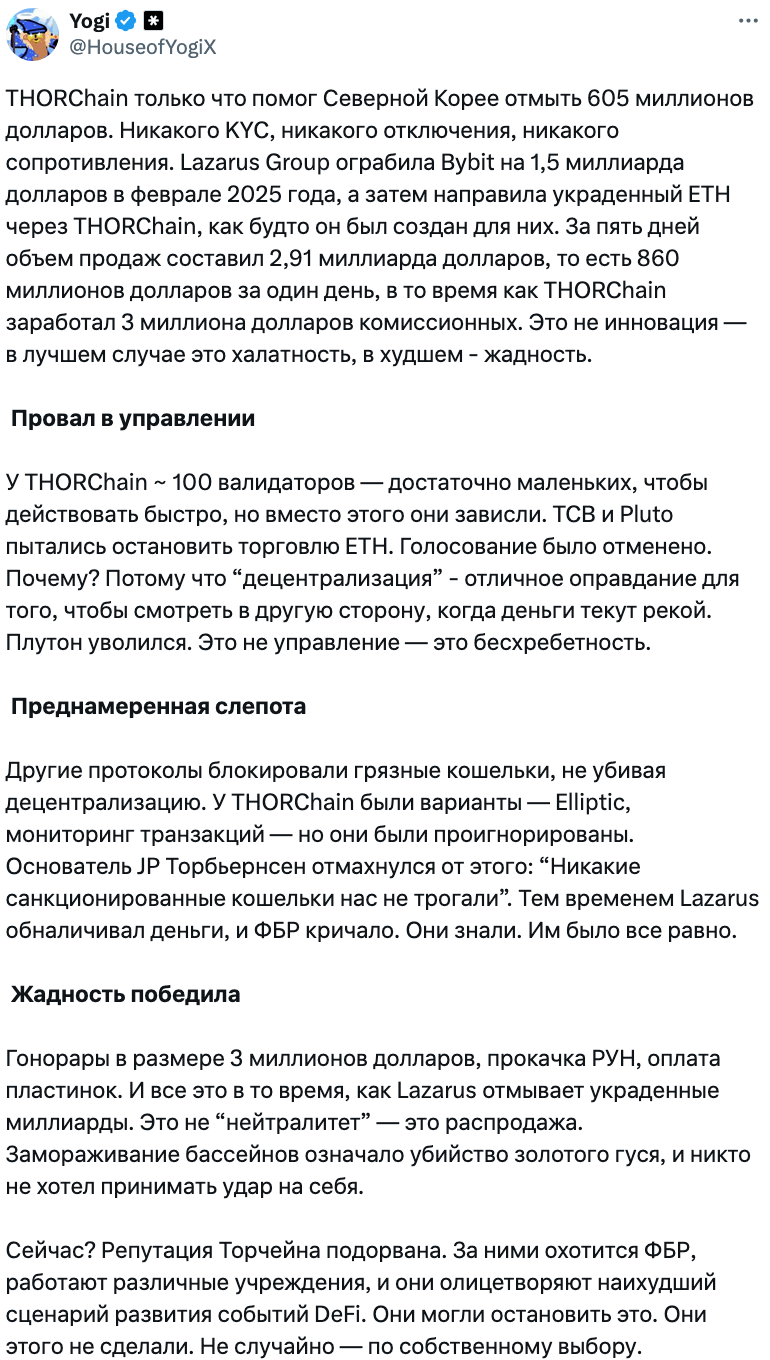 «THORChain только что помог Северной Корее отмыть 605 миллионов долларов. Никакого KYC, никакого отключения, никакого сопротивления. Lazarus Group взломала Bybit на 1,5 миллиарда долларов в феврале 2025 года, а затем направила украденные ETH через THORChain, как будто он был создан для них», — написал крипто-комментатор Yogi в сообщении X 4 марта.