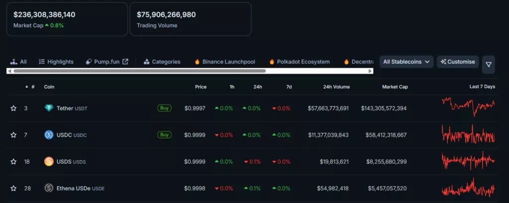 Рыночная капитализация сегмента «стабильных монет» достигла $236 млрд, превысив соответствующий показатель эфира ($230 млрд на момент написания).