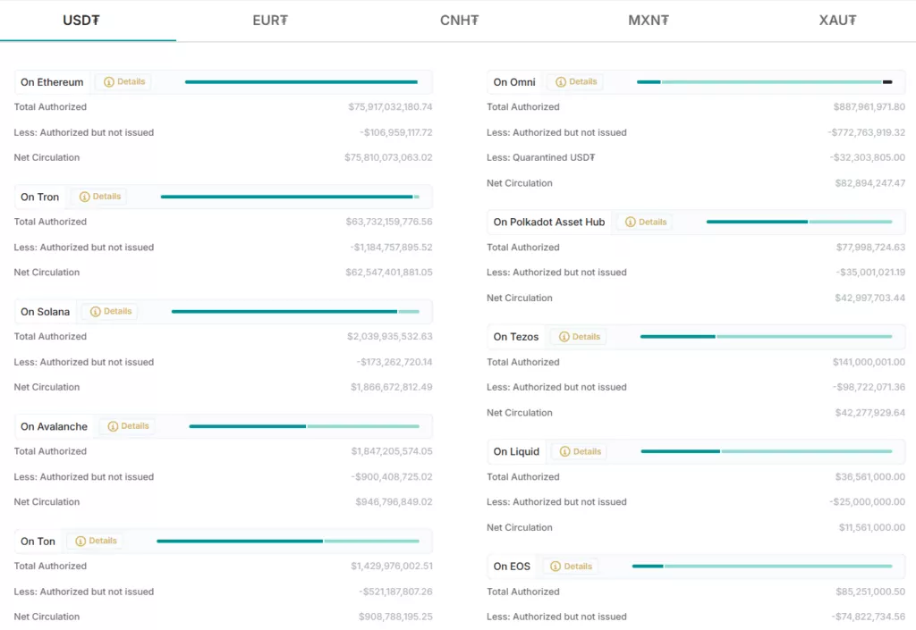 Большая часть USDT выпущена на Ethereum — на $75,9 млрд; немного меньше монет — на Tron ($63,7 млрд); на Solana — $2 млрд.
