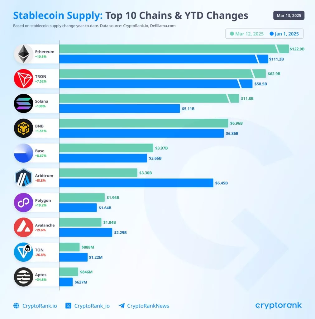 «С начала года предложение стейблкоинов в сети Solana выросло с $5 млрд до $11,8 млрд. Основную долю занимает USDC — $9,2 млрд, что напоминает ситуацию в сети Base, где эта монета также доминирует и составляет 92% от общего объема», — отметили эксперты.