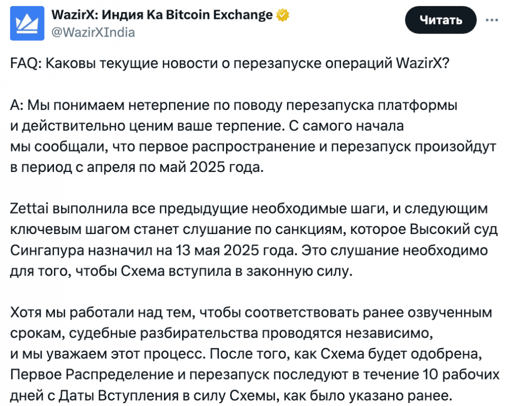 «Мы понимаем нетерпение по поводу перезапуска платформы и действительно ценим ваше постоянное терпение», — пишет WazirX.