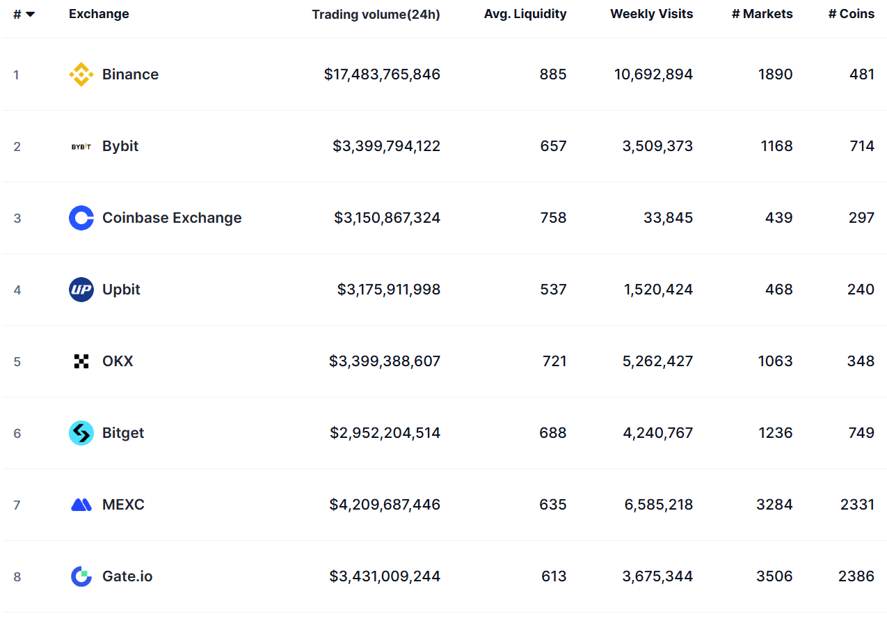Лучшие криптовалютные спотовые биржи по состоянию на 24 апреля на основе ежедневного объема торгов. Источник: CoinMarketCap