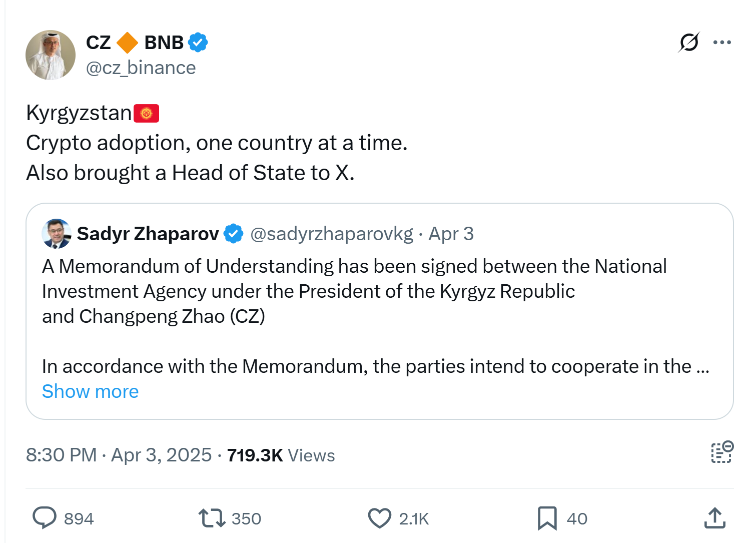 4 апреля бывший генеральный директор Binance Чанпэн «CZ» Чжао заявил, что начнет консультировать Кыргызстан по вопросам регулирования блокчейна и криптовалют после подписания меморандума о взаимопонимании с иностранным инвестиционным агентством страны.