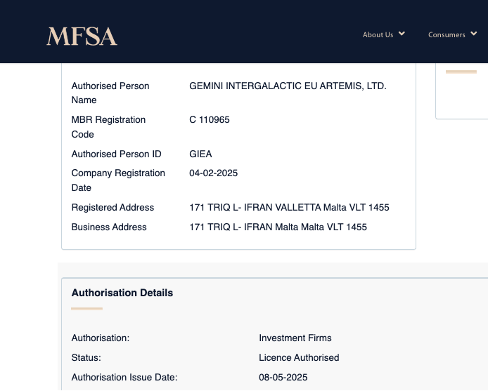 Согласно записям MFSA, мальтийское подразделение Gemini, Gemini Intergalactic EU Artemis, получило лицензию 8 мая.