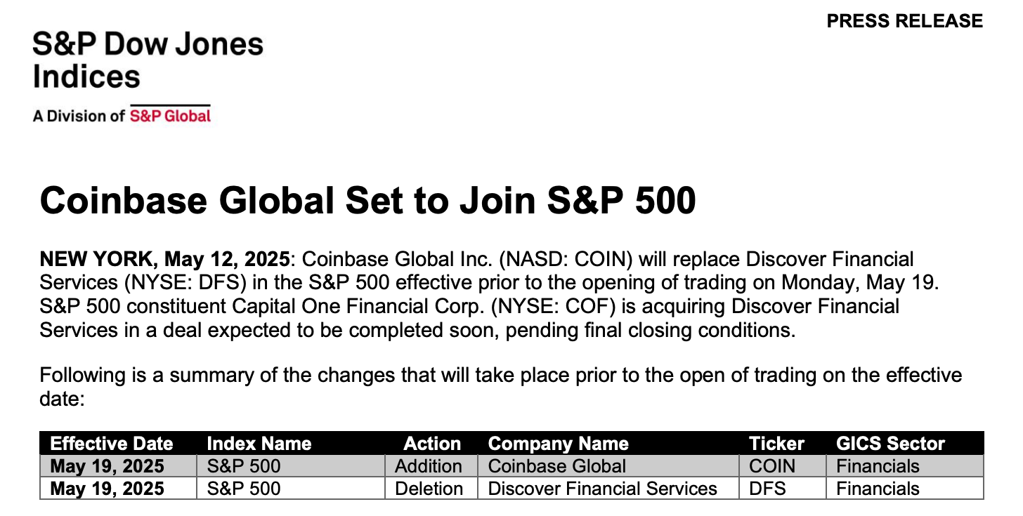 Официальная «перестановка» произойдёт до открытия торгов 19 мая. Coinbase заменит Discover Financial Services, которая в процессе слияния с Capital One. Ключевой фактор включения в индекс — прибыльность. И тут Coinbase не подкачала: $65,6 млн чистой прибыли за квартал, $0,24 на акцию. Выручка — $2,03 млрд, +24% к прошлому году. Да, до пиков 2021 года, когда акции доходили до $357, ещё далеко, но текущая капитализация в $53 млрд и стабильная динамика роста говорят сами за себя — криптогигант держит планку.