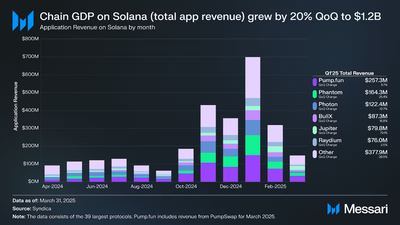 Согласно отчету Messari, совокупный доход децентрализованных приложений в сети Solana (Chain GDP) составил $1,2 млрд за квартал — это на 20% больше, чем в предыдущем периоде. Январь стал главным драйвером — именно на этот месяц пришлось почти 60% квартальной выручки.