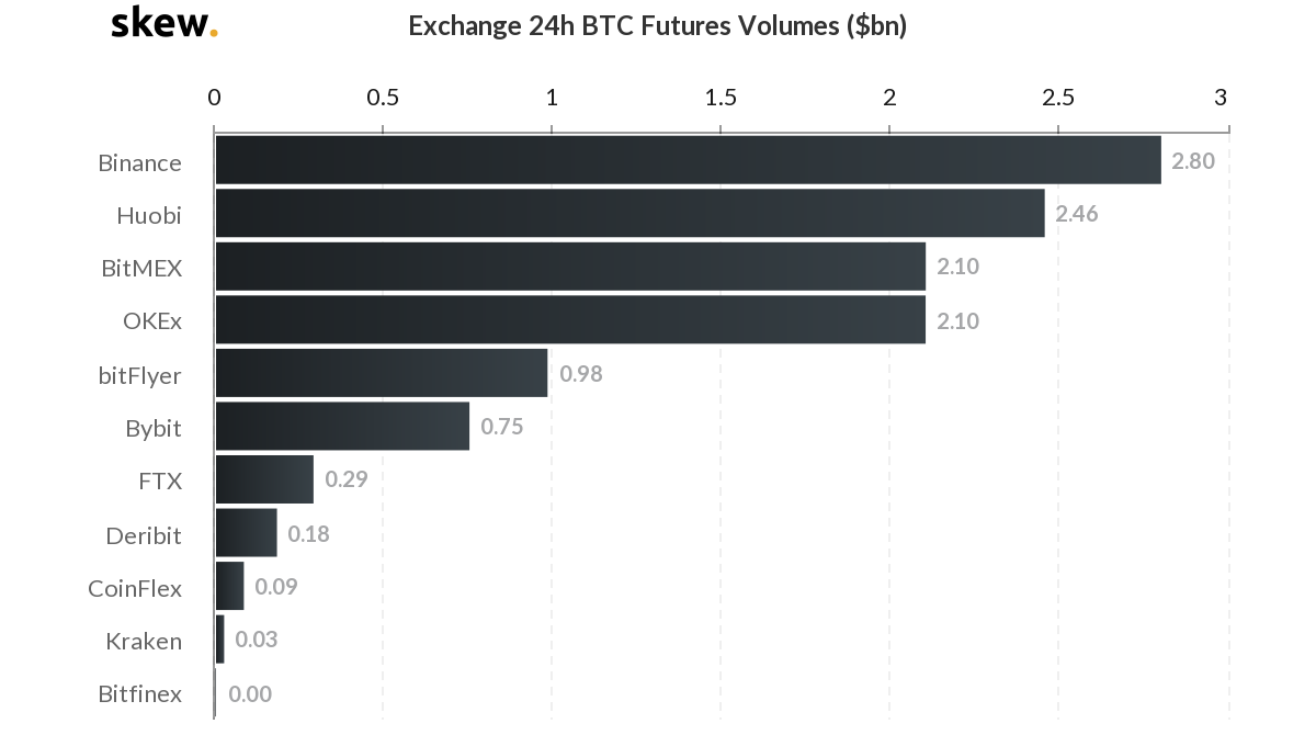 Binance Futures стала крупнейшей площадкой фьючерсного рынка после снижения цен в прошлом месяце, и это также подтверждают данные, представленные аналитической компанией Skew. По состоянию на 21 апреля суточный объем торговли фьючерсами на биткоин на Binance составлял $2.8 млрд против $2.1 млрд на BitMEX и $2.46 млрд на Huobi.