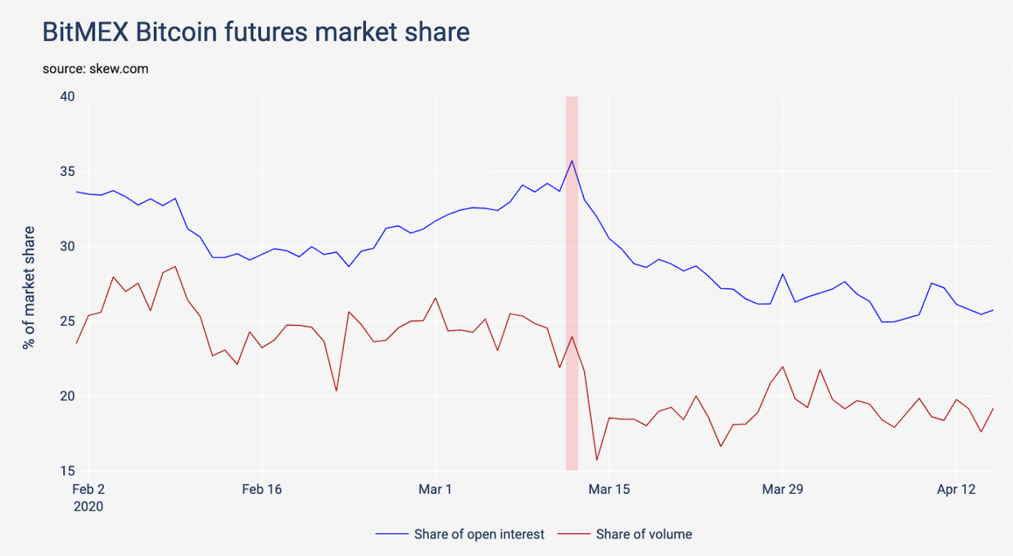 По данным Coinmetrics, доля BitMEX на фьючерсном рынке по общей сумме нереализованных контрактов снизилась с 35% в середине марта до 25% в середине апреля. Доля BitMEX на рынке по объему торгов фьючерсами за тот же период упала с 25% до 20%. Несмотря на небольшую попытку восстановления обоих показателей к 30 марта, в апреле объемы продолжали снижаться.