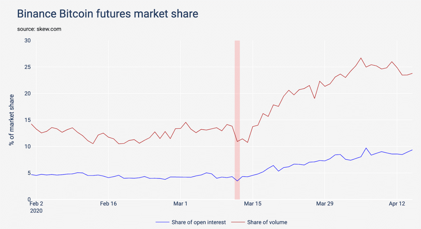 После падения рынков в середине марта, биржа криптовалютных деривативов BitMEX продолжает уступать свою долю в торгах фьючерсами на биткоин Binance и другим площадкам.