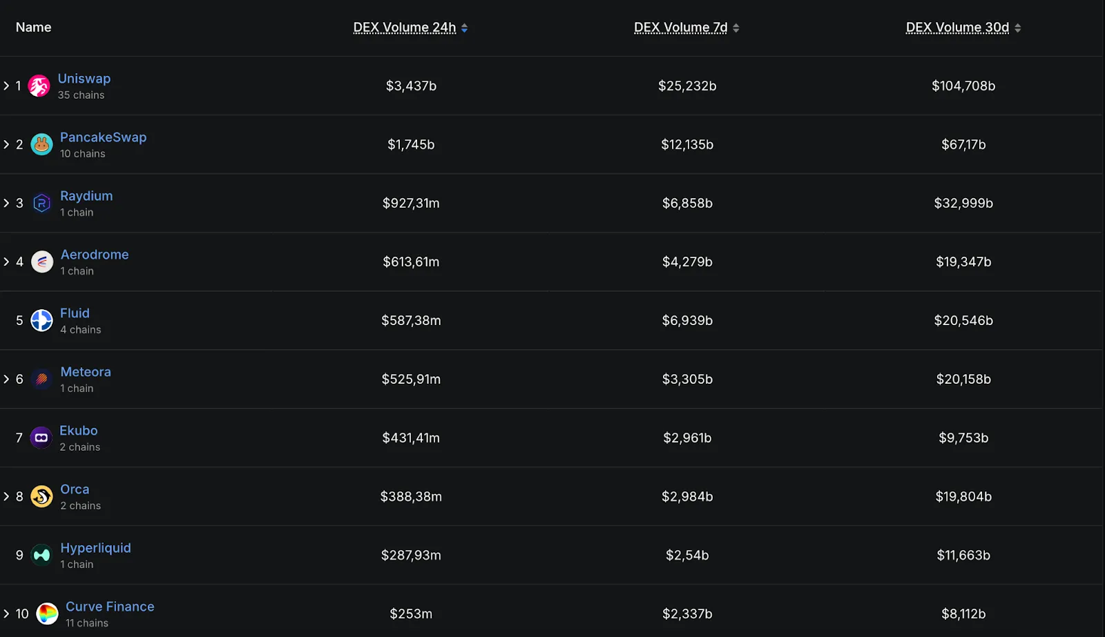 По данным DeFi Llama, биржа занимает второе место среди крупнейших DEX. Ее суточный объем торгов превышает $1,7 млрд.