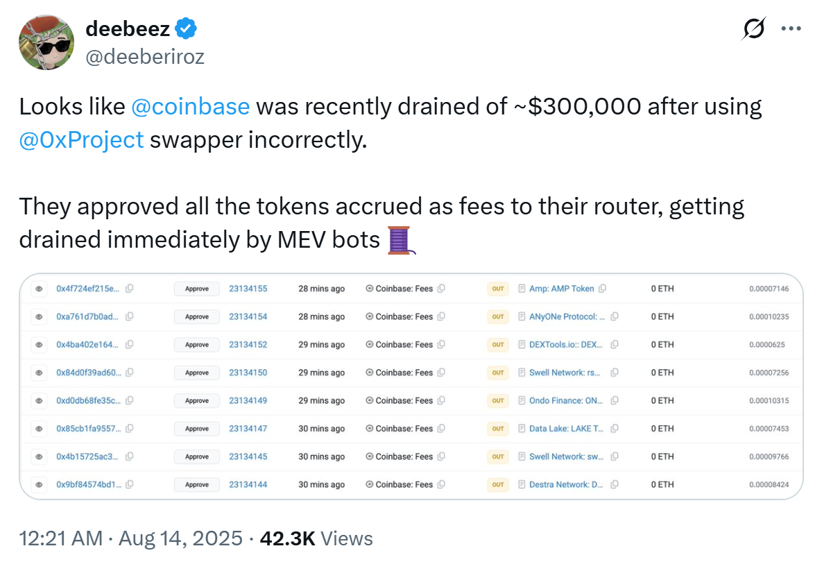 Coinbase лишилась около $300 000 комиссионных сборов за токены, непреднамеренно предоставив доступ к активам через смарт-контракт 0x Project. Это позволило боту MEV вывести средства.