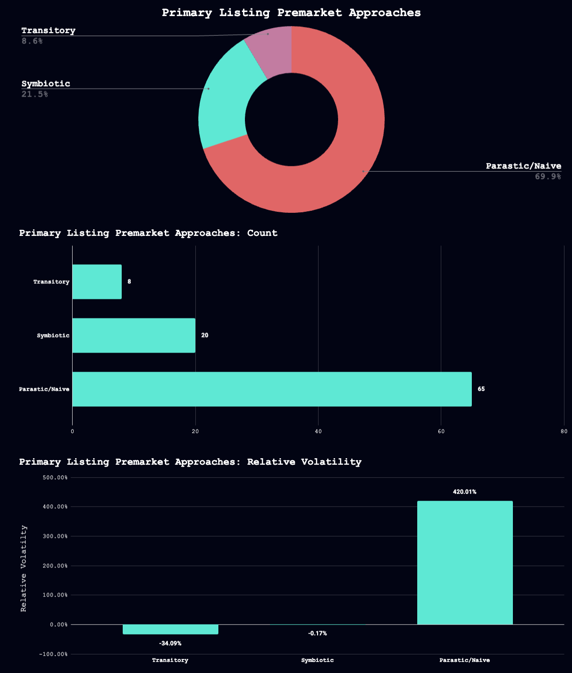 Более того, 69,9% первичных листингов токенов оказались «паразитическими», когда маркет-мейкеры использовали условия премаркета, создавая искусственный дефицит и раздувая ажиотаж вокруг токена.
