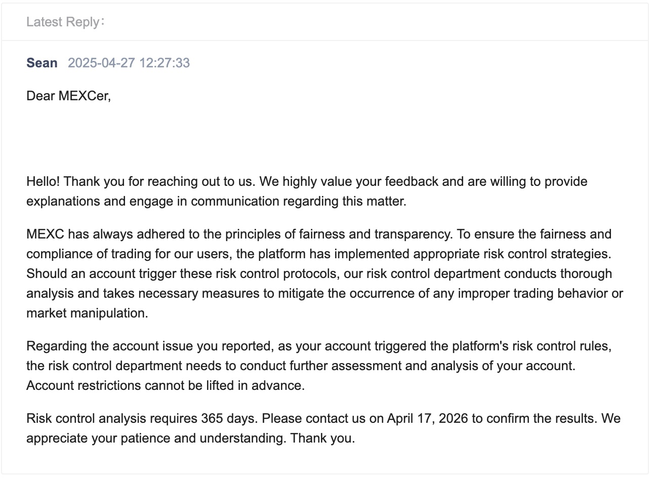 Тем не менее ограничения по счету «вводятся исключительно в связи с нарушением наших правил контроля рисков, а не из-за прибыльности», — заявил представитель MEXC, добавив, что 12-месячный период проверки биржи применяется «исключительно к счетам, замешанным в скоординированных нарушениях, счетам с высоким уровнем риска или рискам, связанным с соблюдением требований, и не распространяется на всех пользователей, подпадающих под меры контроля рисков».