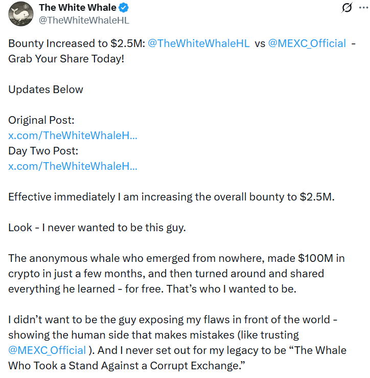 Во вторник трейдер объявил об увеличении «награды» против MEXC до $2,5 млн, выделив дополнительно $250 000 группе пользователей, участвующих в его кампании в социальных сетях. Кампания включает выпуск бесплатного невзаимозаменяемого токена (NFT) в сети Base и маркировку аккаунта MEXC или его главного операционного директора тегом «#FreeTheWhiteWhale».