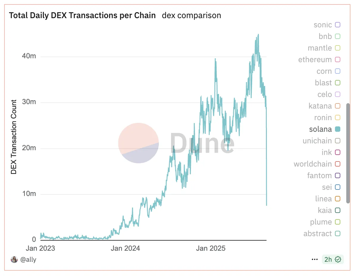 В начале года доля объема DEX на Solana составляла 76%. По состоянию на 28 августа показатель опустился до 26%.