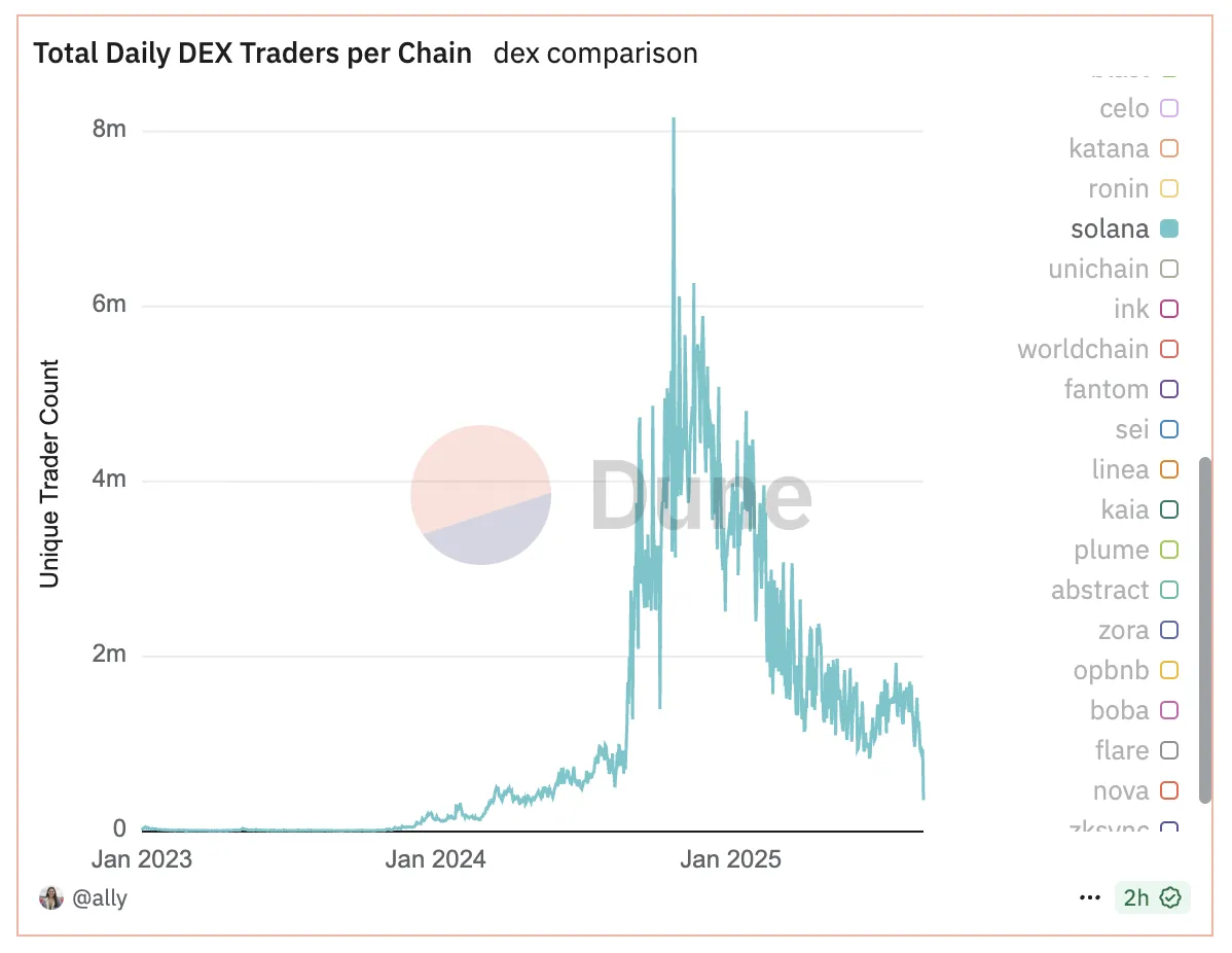 Количество трейдеров на DEX в сети Solana устойчиво снижается. Аналитики связывают это с участившимися случаями мошенничества в сегменте мем-коинов.