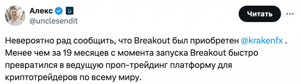 В четверг криптовалютная биржа Kraken объявила о приобретении Breakout, стартапа, который предоставляет трейдерам капитал до $200 тыс в рамках методологии строгой оценки, проверяющей управление рисками и стратегическую дисциплину.