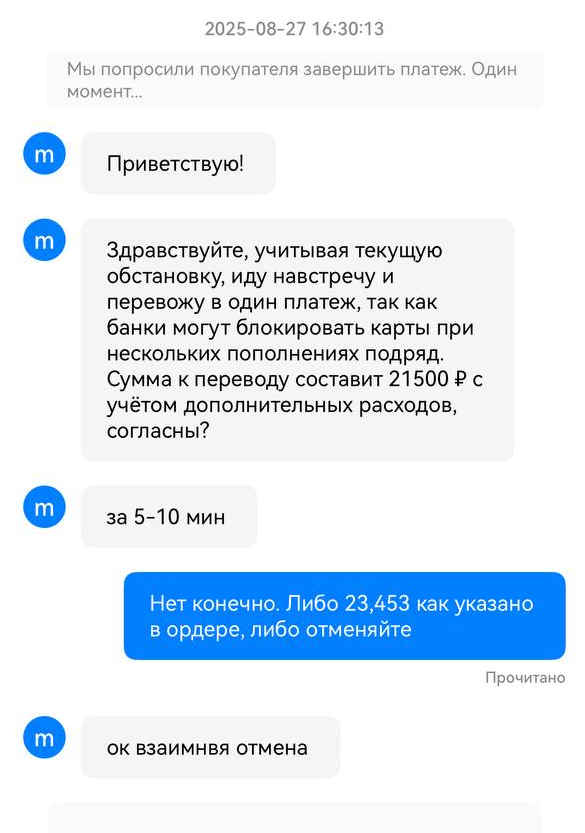 «Решение» проблемы пришло быстро. Теперь некоторые мерчанты предлагают продавцам криптовалюты на P2P не дробить платеж взамен на дополнительные сборы. Якобы таким образом они идут навстречу клиенту. Проценты поверх оговоренной по условиям сделки суммы они объясняют некими дополнительными расходами. Ну а чтобы клиент согласился, мерчант давит на риски блокировки карты.