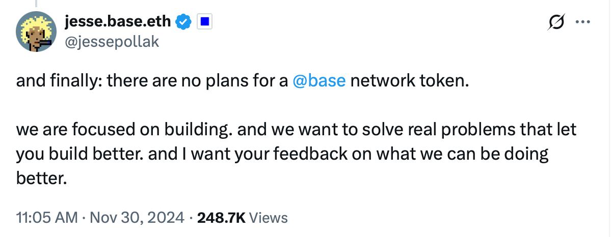 «Base предназначен для всех, и сетевой токен может помочь большему числу людей принять участие в ончейн-экономике Base».