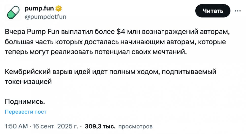 Рост Pump.fun происходит на фоне развития платформы для прямых трансляций. В понедельник протокол сообщил о выплате вознаграждений авторам в размере $4 млн. Большая часть средств была направлена авторам, впервые разместившим контент.