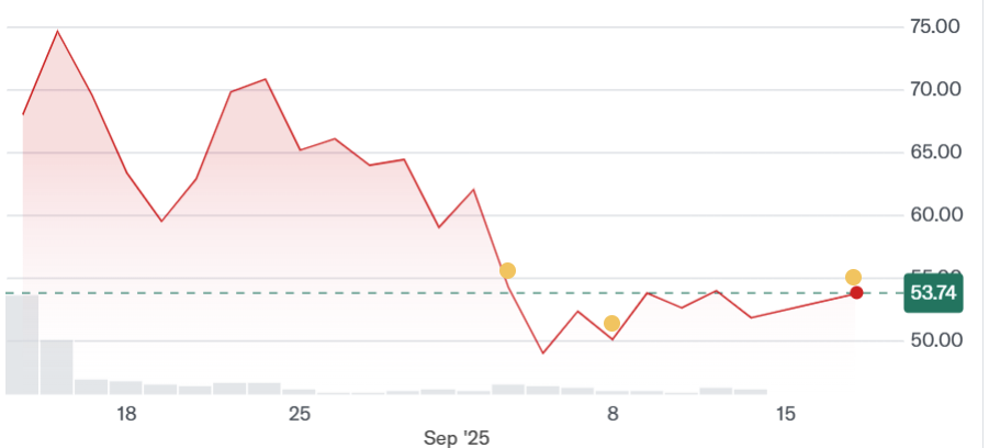 По данным Yahoo Finance, цена первичного публичного размещения акций Bullish составила 37 долларов за акцию, а на пике цена выросла до 118 долларов. Сейчас акции торгуются около 54 долларов за каждую, что соответствует рыночной капитализации компании около 7 500 000 000 долларов.